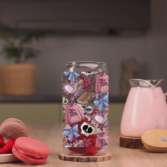 Give your 16oz Libbey Glass Cans an edgy, cute-but-dark vibe with this pastel crime scene UV DTF Cup Wrap. Featuring unique illustrated elements like bows, hearts, coffee mugs, crime scene notes, skulls, and dripping accents. This wrap blends soft aesthetic colors with a playful true crime themes. Perfect for true crime lovers, pastel aesthetic fans and unique custom cup creators.