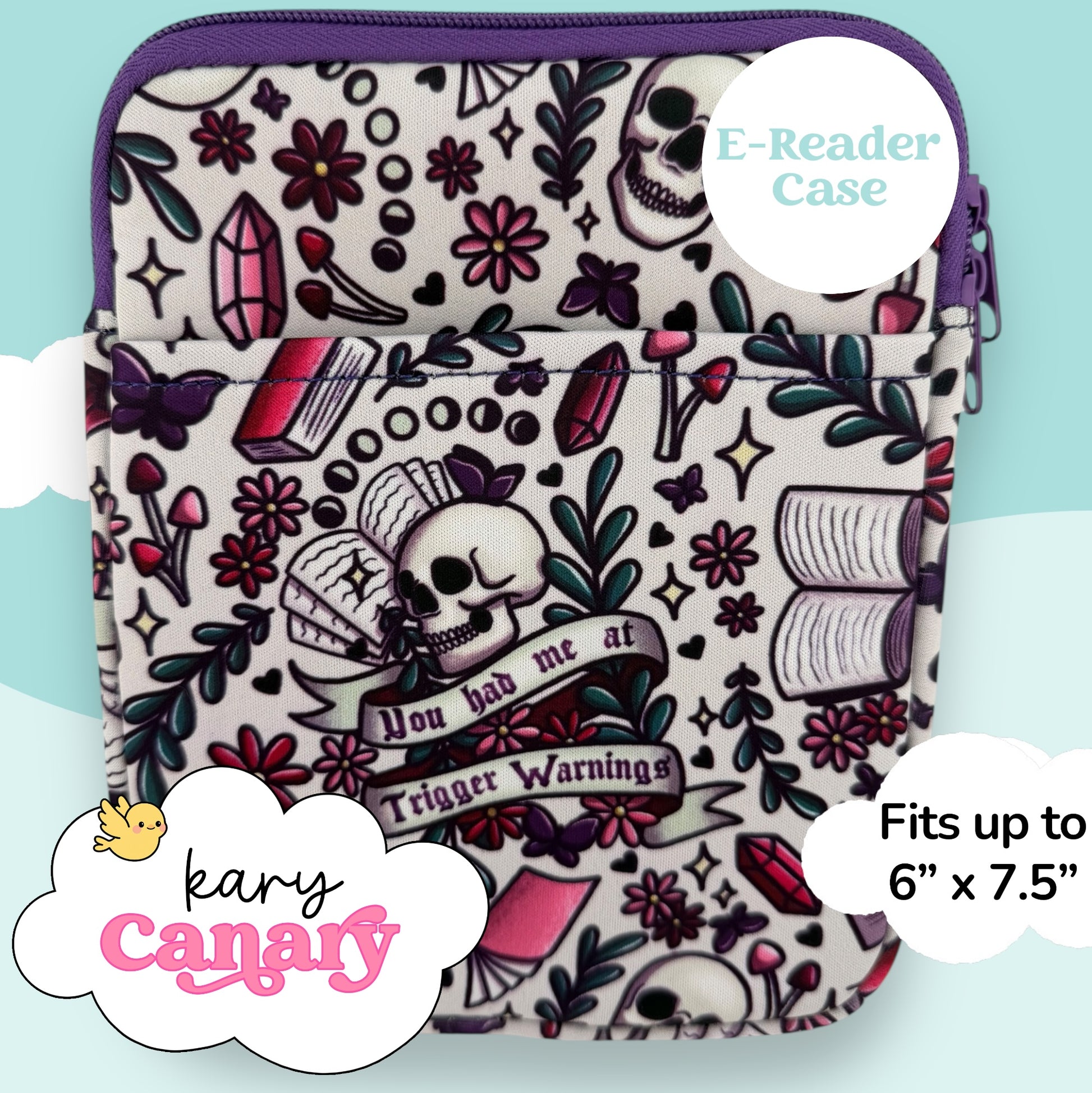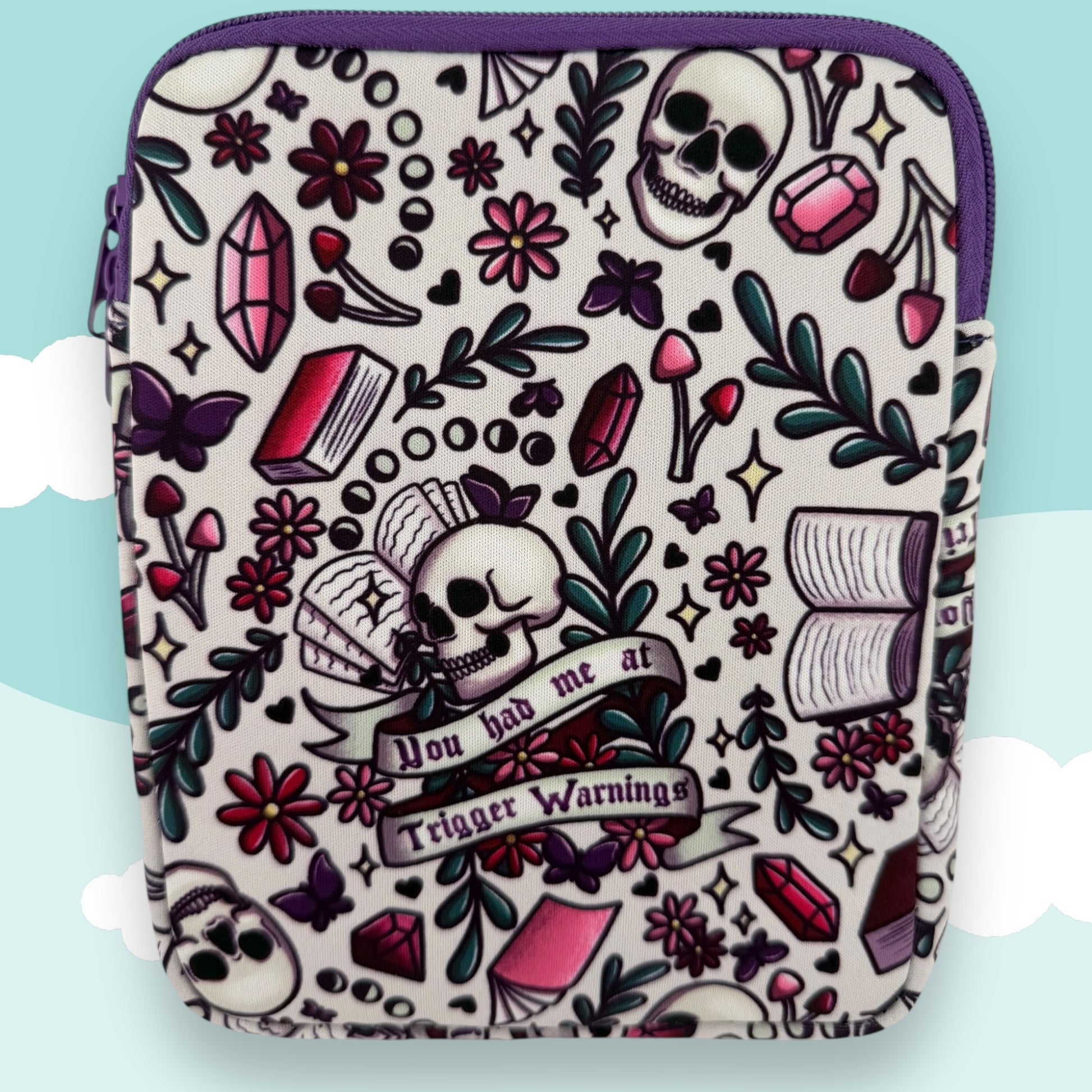 If your favorite books require a three-paragraph content warning, this is your Kindle’s soulmate. This playful dark-cottagecore sleeve features skulls, open books, crystals, flowers, and the irresistible quote “You had me at Trigger Warnings.” Designed to fit devices up to 6” x 7.5”, it keeps your e-reader cushioned and protected—because the angst may be heavy, but your Kindle shouldn’t be.